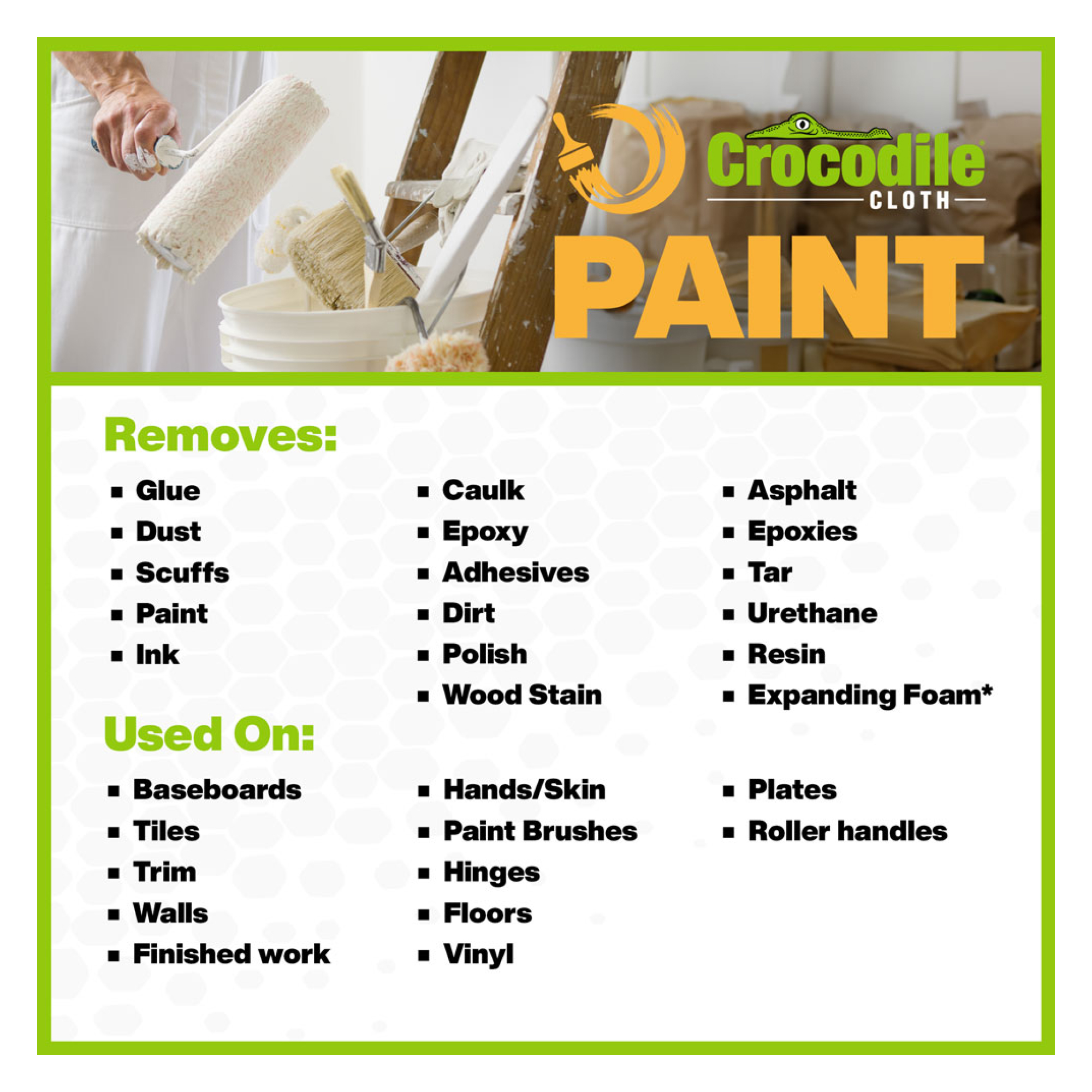 Painters, contractors, artists and DIYers will love the Crocodile Cloth® Paint series. We designed this cloth specifically for painting surface prep and cleanup of painting messes. Use for damp-dusting and removal of oils, adhesives and residues prior to painting. The low-lint cloth picks up dust and residues and leaves nothing behind. Safe on wood, metals and other surfaces.